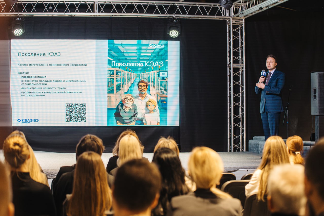 Особый интерес аудитории вызвали примеры успешных творческих коллабораций — от музыкальных симфоний под звук работы производственных линий до нейрокомикса «Поколение КЭАЗ», созданного «в партнерстве» с ИИ. Это уникальный формат, транслирующий идеи осознанного профессионального выбора и преемственности поколений, особенно актуальные для КЭАЗ: за 80-летнюю историю на предприятии сформировано 29 трудовых династий. Общий стаж работы некоторых семей на предприятии составляет более ста лет.