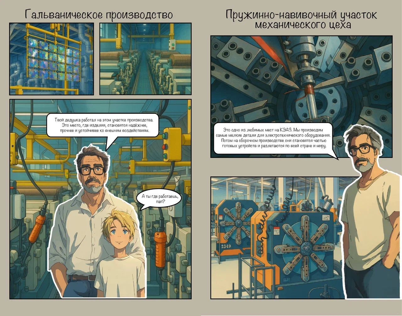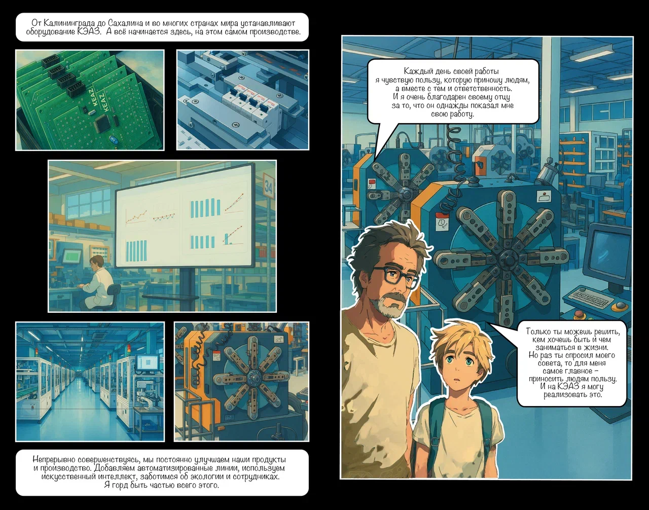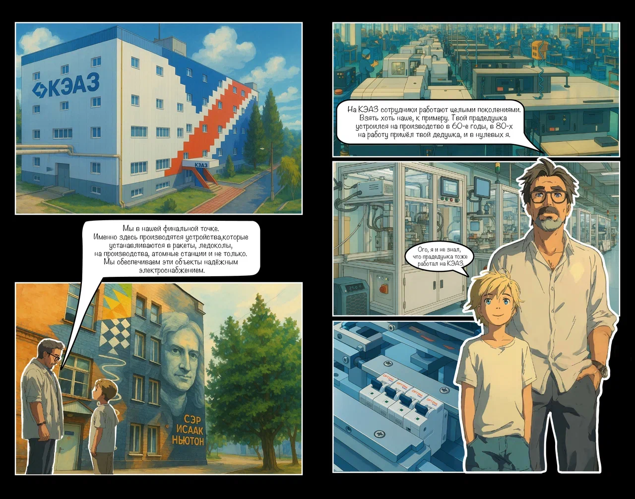 КЭАЗ, ведущий отечественный производитель электротехнического оборудования, предложил нестандартное решение — нейрокомикс «Поколение КЭАЗ». Проект, созданный «в партнерстве» с искусственным интеллектом, стал не просто экспериментом в подаче информации, а полноценным коммуникационным инструментом.