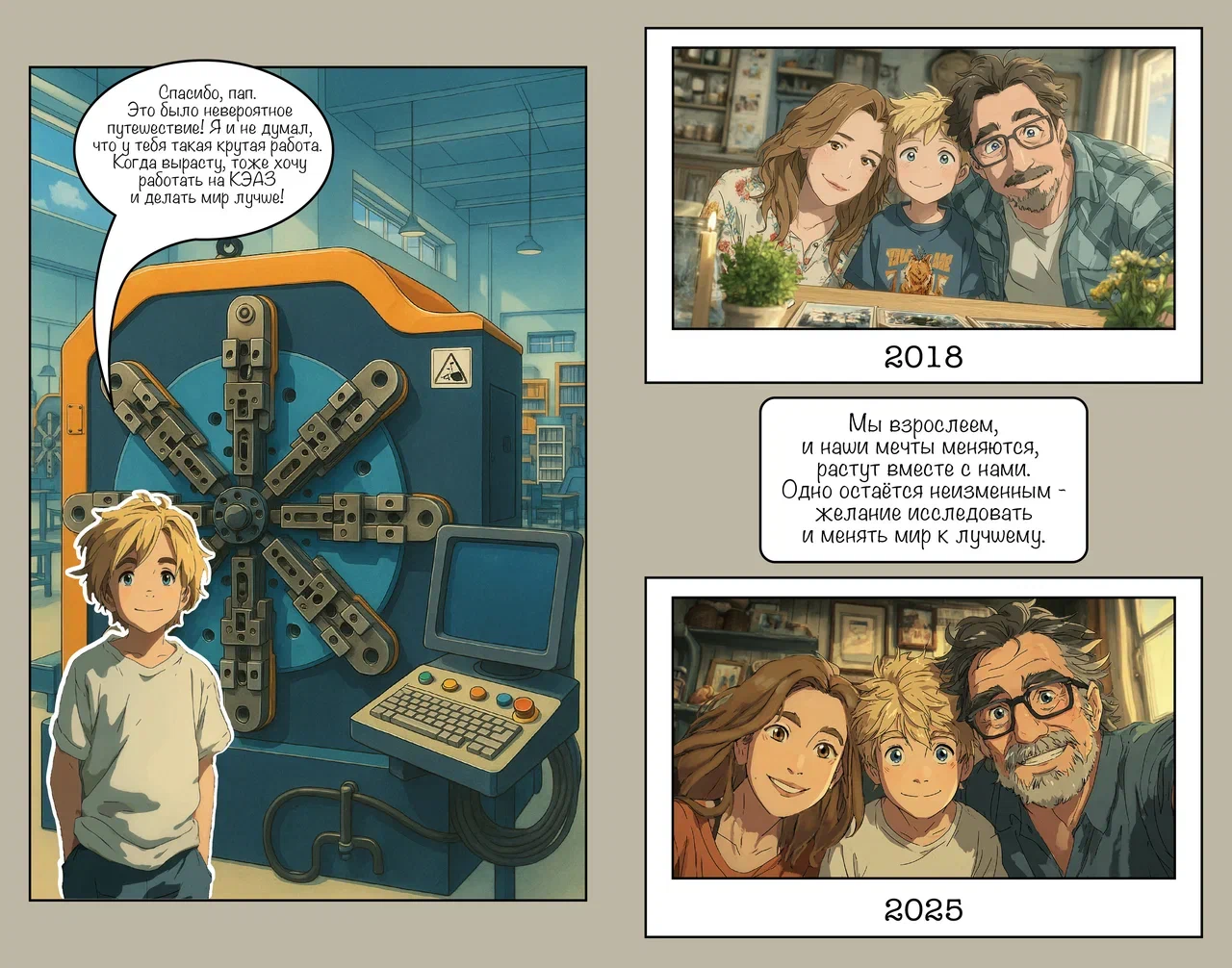КЭАЗ использует искусственный интеллект не только для решения производственных и управленческих задач, но и для реализации гуманитарных и просветительских инициатив. Это яркое свидетельство зрелой цифровой культуры компании, отвечающей запросам современности. Формат комикса обеспечивает прямой и эффективный диалог с поколением Z. Такая подача идеально соответствует задачам нацпроекта «Молодежь и дети», предлагая интуитивно понятный и привлекательный для молодой аудитории контент, в отличие от традиционных форматов, не всегда позволяющих «достучаться» до адресатов. Отметим, что в работе над проектом приняла участие дочь одного из сотрудников компании, только начинающая свой студенческий путь.