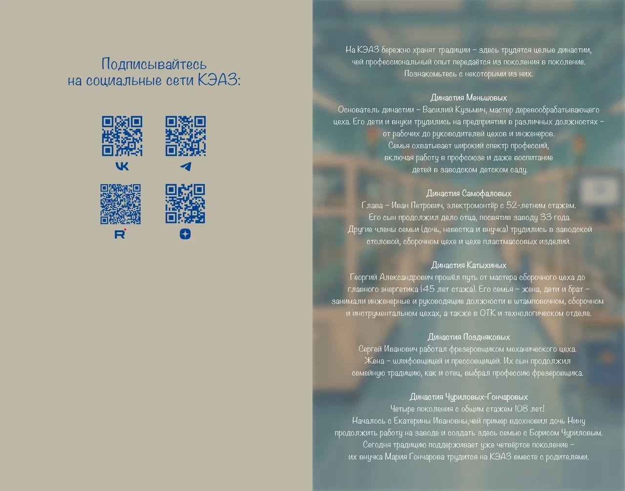 Семейная преемственность в профессии — ценный ресурс, обеспечивающий передачу опыта сотрудниками КЭАЗ. За 80-летнюю историю на предприятии сложилось 29 профессиональных династий, а общий стаж работы в компании у некоторых семей составляет более 100 лет.