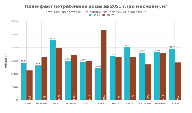 Объём потребления воды также снижается относительно плана, за исключением отдельных месяцев, где перерасход был связан с нештатными ситуациями и стал предметом дополнительного анализа.